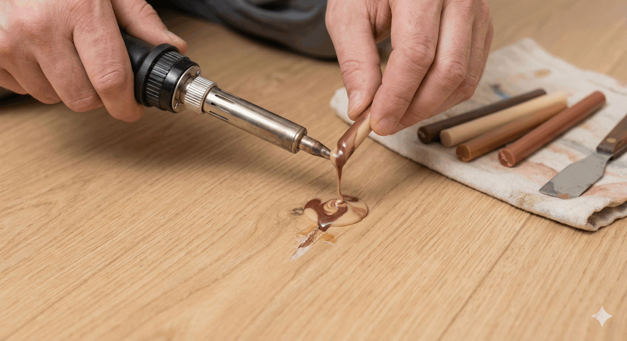 - 調色:電気コテでハードワックスを溶かし、床色に合わせて色を作る。